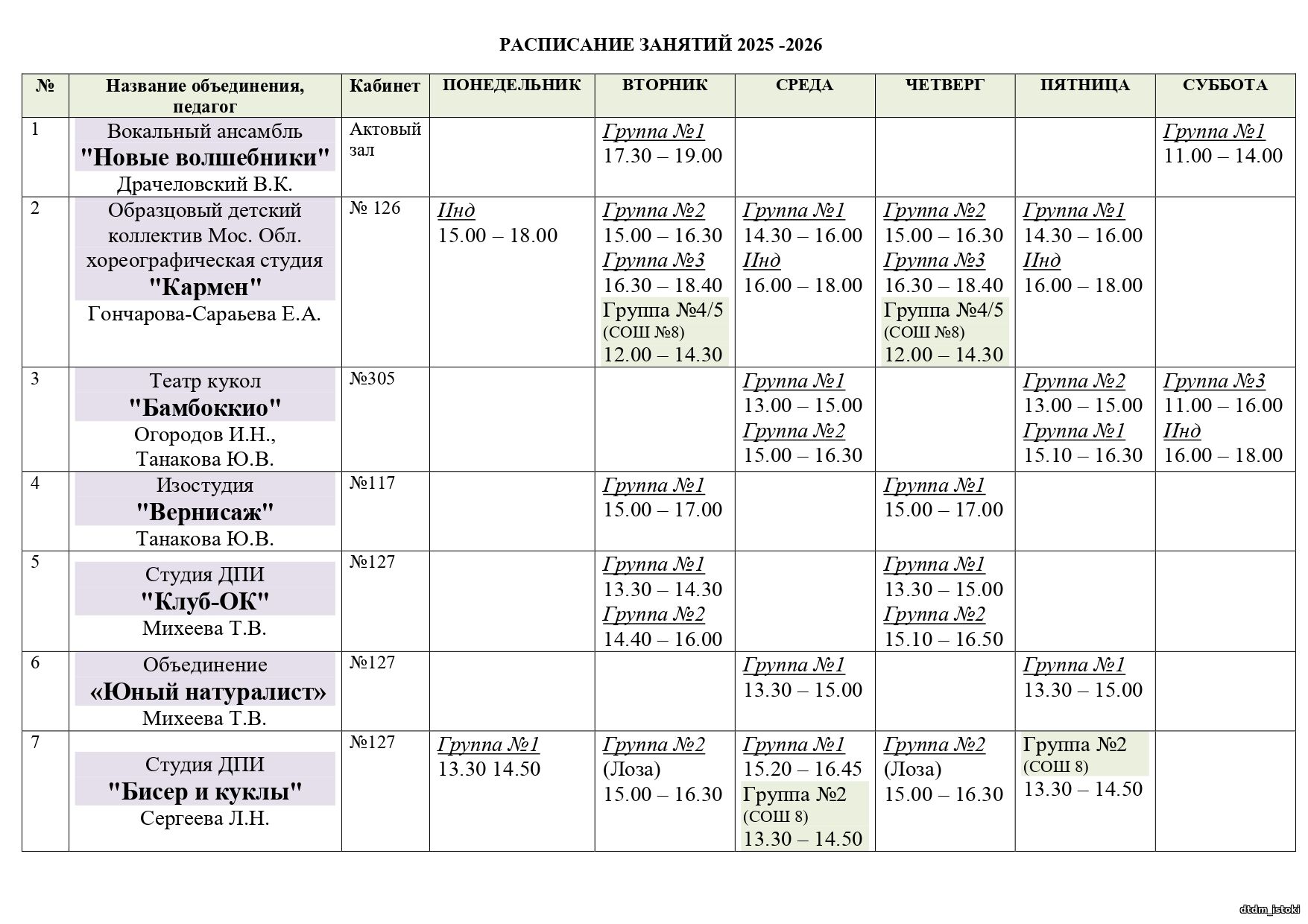Перечень студий, объединений, расписание на 2025-2026 учебный год